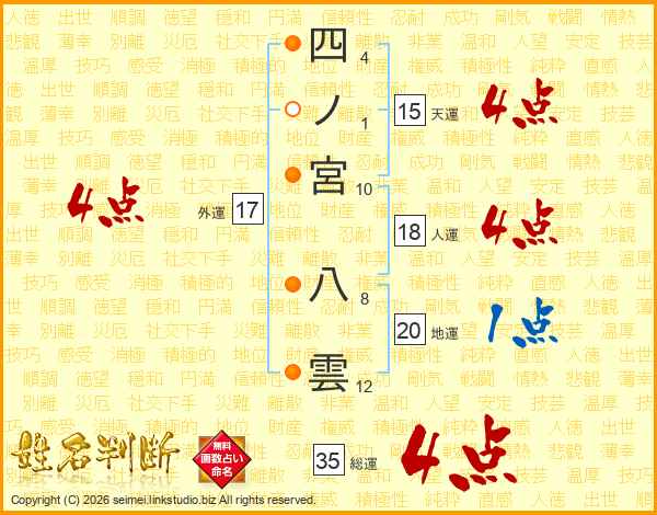 生活面を象徴する運勢です。外部から受ける影響力を表し、結婚運、家庭運や職場、環境への順応性を表します。総運から人運を引いた画数。姓や名が1文字の場合を除く。