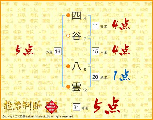 生活面を象徴する運勢です。外部から受ける影響力を表し、結婚運、家庭運や職場、環境への順応性を表します。総運から人運を引いた画数。姓や名が1文字の場合を除く。
