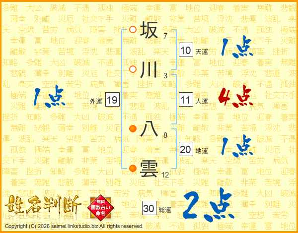生活面を象徴する運勢です。外部から受ける影響力を表し、結婚運、家庭運や職場、環境への順応性を表します。総運から人運を引いた画数。姓や名が1文字の場合を除く。