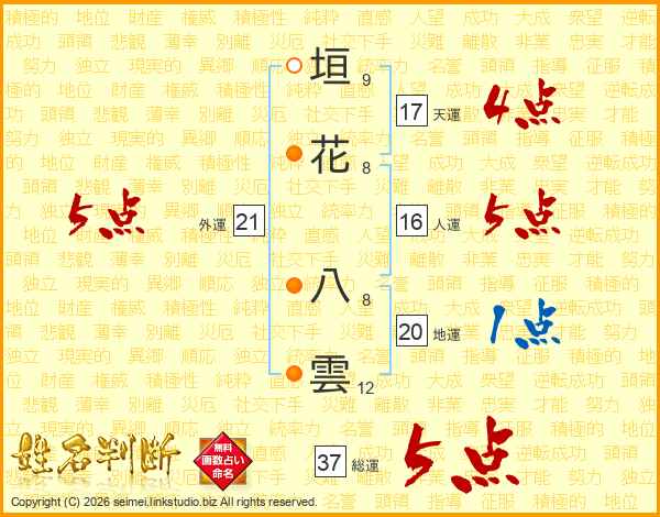 生活面を象徴する運勢です。外部から受ける影響力を表し、結婚運、家庭運や職場、環境への順応性を表します。総運から人運を引いた画数。姓や名が1文字の場合を除く。