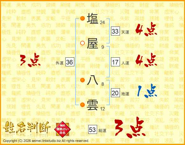 塩(24画)屋(9画) 八(8画)雲(12画)