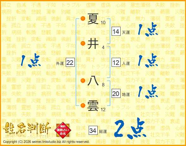 生活面を象徴する運勢です。外部から受ける影響力を表し、結婚運、家庭運や職場、環境への順応性を表します。総運から人運を引いた画数。姓や名が1文字の場合を除く。