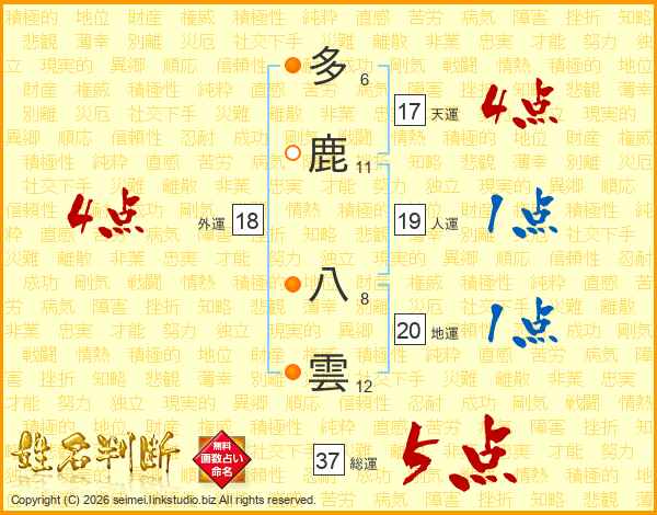多鹿八雲さんの総運は37画の5点!