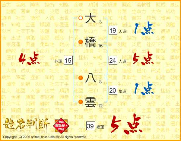 あなたの人生を表す1番重要な運勢です。生涯を通じて影響する総合運となり、主に50歳以降の晩年期に影響を及ぼします。苗字と名前の合計画数。