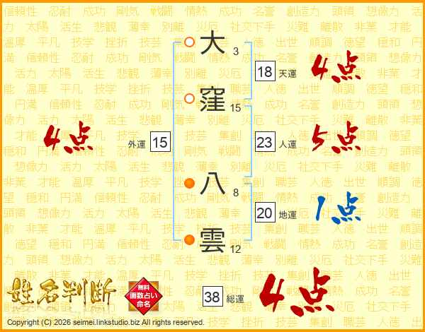 生活面を象徴する運勢です。外部から受ける影響力を表し、結婚運、家庭運や職場、環境への順応性を表します。総運から人運を引いた画数。姓や名が1文字の場合を除く。