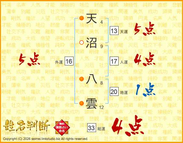 天沼八雲さんの総運は33画の4点!