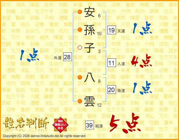 安孫子八雲さんの総運は39画の5点!