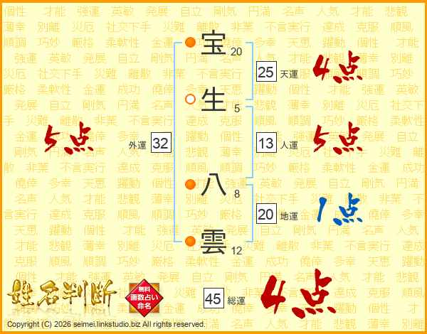 生活面を象徴する運勢です。外部から受ける影響力を表し、結婚運、家庭運や職場、環境への順応性を表します。総運から人運を引いた画数。姓や名が1文字の場合を除く。