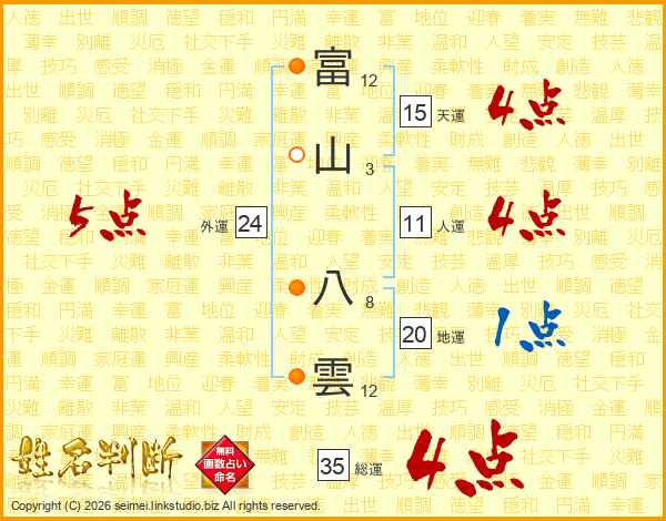 生活面を象徴する運勢です。外部から受ける影響力を表し、結婚運、家庭運や職場、環境への順応性を表します。総運から人運を引いた画数。姓や名が1文字の場合を除く。
