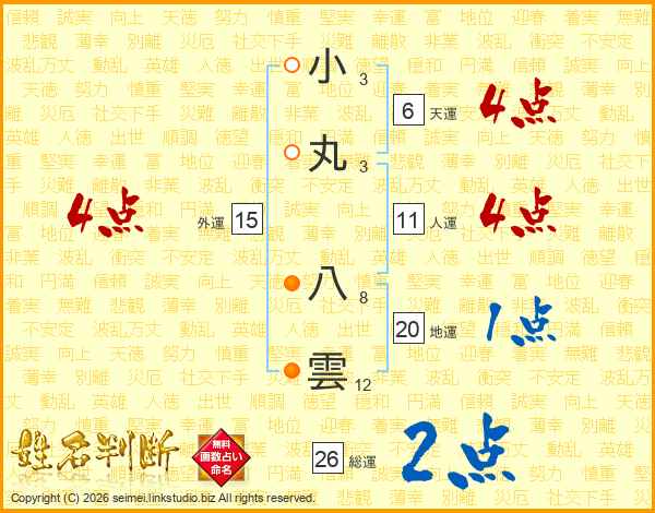 生活面を象徴する運勢です。外部から受ける影響力を表し、結婚運、家庭運や職場、環境への順応性を表します。総運から人運を引いた画数。姓や名が1文字の場合を除く。