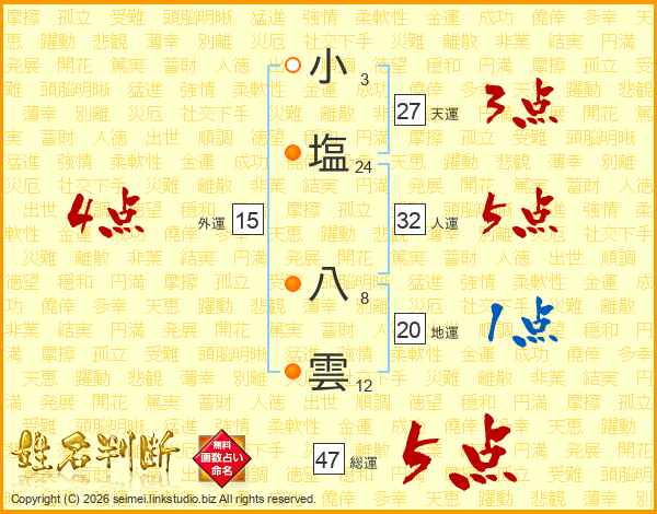 小塩八雲さんの総運は47画の5点!