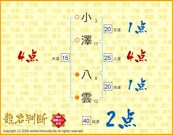 生活面を象徴する運勢です。外部から受ける影響力を表し、結婚運、家庭運や職場、環境への順応性を表します。総運から人運を引いた画数。姓や名が1文字の場合を除く。
