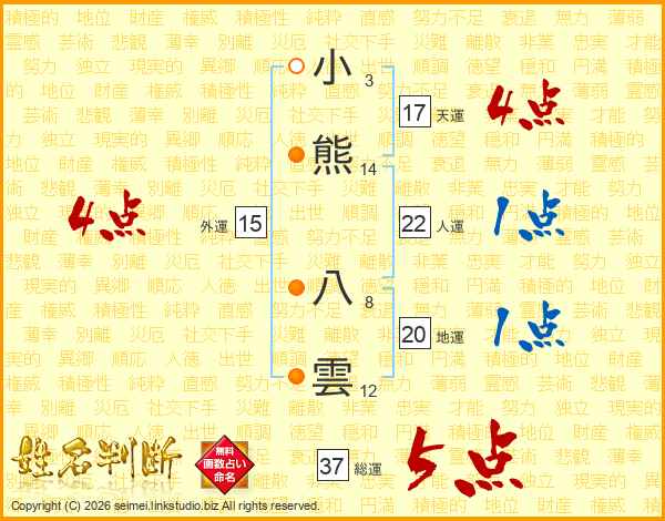 小熊八雲さんの総運は37画の5点!