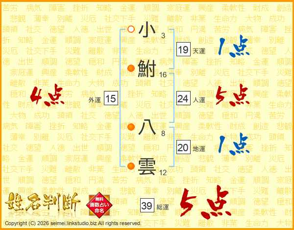 生活面を象徴する運勢です。外部から受ける影響力を表し、結婚運、家庭運や職場、環境への順応性を表します。総運から人運を引いた画数。姓や名が1文字の場合を除く。