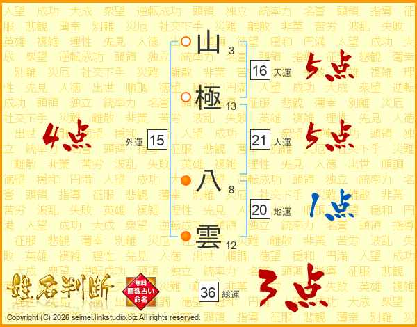 あなたの人生を表す1番重要な運勢です。生涯を通じて影響する総合運となり、主に50歳以降の晩年期に影響を及ぼします。苗字と名前の合計画数。