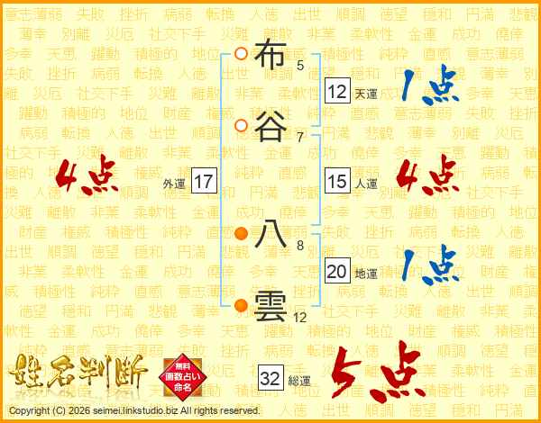 布谷八雲さんの総運は32画の5点!