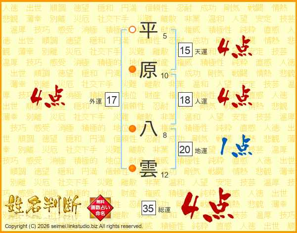 生活面を象徴する運勢です。外部から受ける影響力を表し、結婚運、家庭運や職場、環境への順応性を表します。総運から人運を引いた画数。姓や名が1文字の場合を除く。