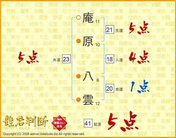 あなたの人生を表す1番重要な運勢です。生涯を通じて影響する総合運となり、主に50歳以降の晩年期に影響を及ぼします。苗字と名前の合計画数。