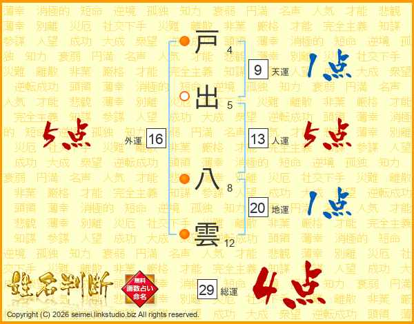 生活面を象徴する運勢です。外部から受ける影響力を表し、結婚運、家庭運や職場、環境への順応性を表します。総運から人運を引いた画数。姓や名が1文字の場合を除く。