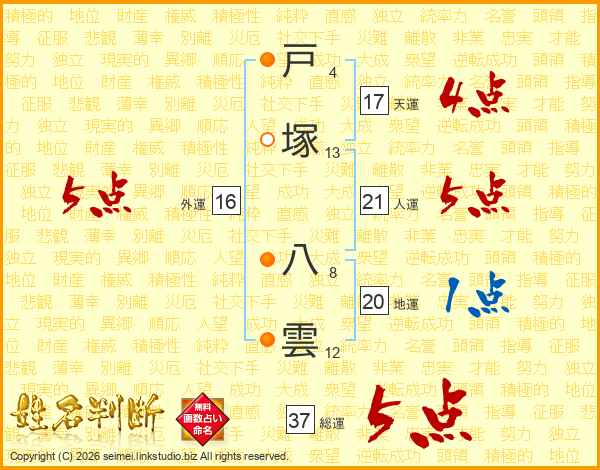 戸塚八雲さんの総運は37画の5点!