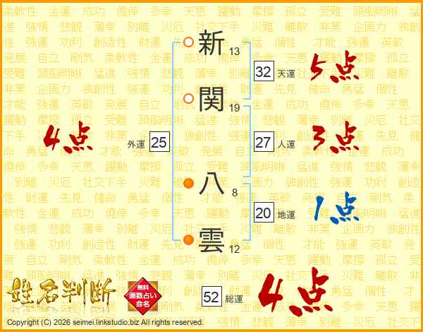 新関八雲さんの総運は52画の4点!