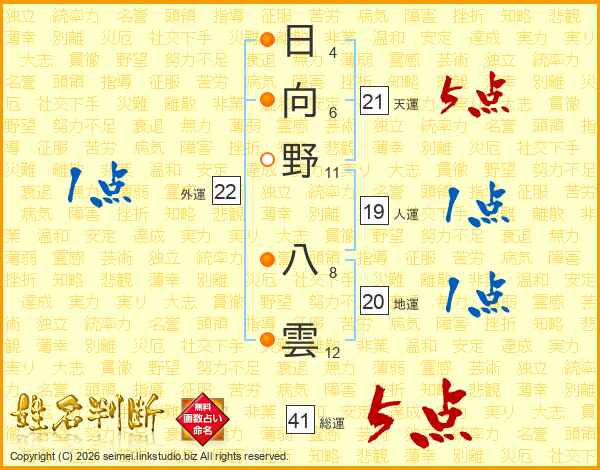 日向野八雲さんの総運は41画の5点!