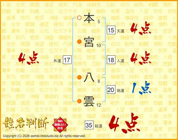 本宮八雲さんの総運は35画の4点!
