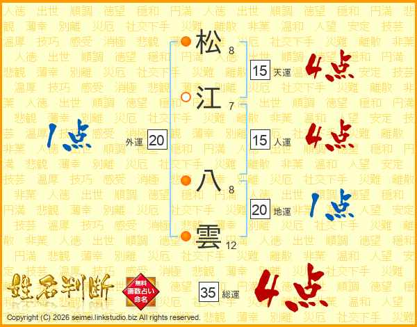 生活面を象徴する運勢です。外部から受ける影響力を表し、結婚運、家庭運や職場、環境への順応性を表します。総運から人運を引いた画数。姓や名が1文字の場合を除く。