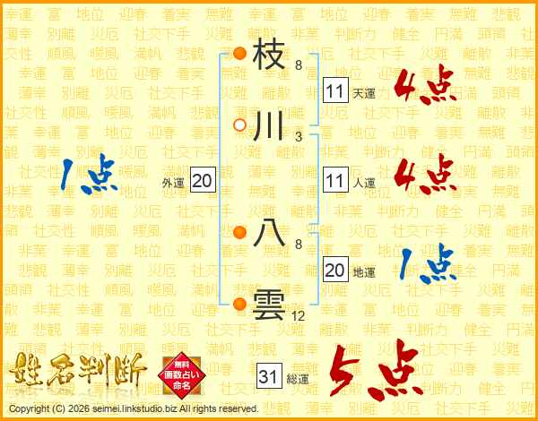 枝川八雲さんの総運は31画の5点!