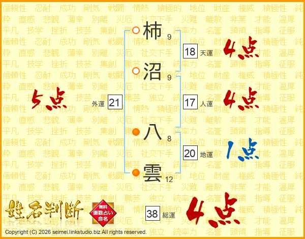 生活面を象徴する運勢です。外部から受ける影響力を表し、結婚運、家庭運や職場、環境への順応性を表します。総運から人運を引いた画数。姓や名が1文字の場合を除く。