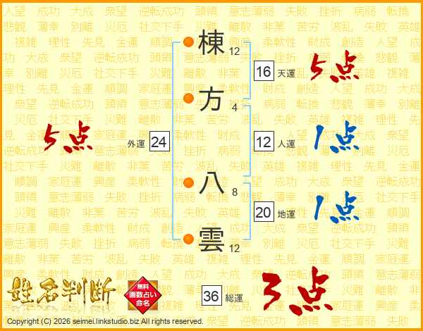 あなたの人生を表す1番重要な運勢です。生涯を通じて影響する総合運となり、主に50歳以降の晩年期に影響を及ぼします。苗字と名前の合計画数。