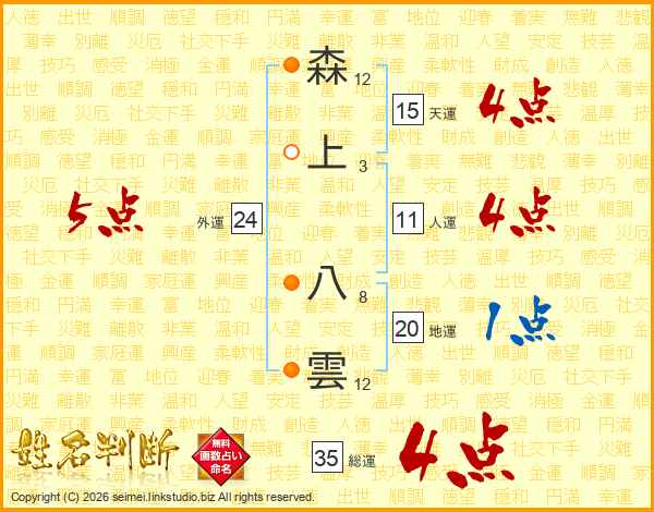 生活面を象徴する運勢です。外部から受ける影響力を表し、結婚運、家庭運や職場、環境への順応性を表します。総運から人運を引いた画数。姓や名が1文字の場合を除く。