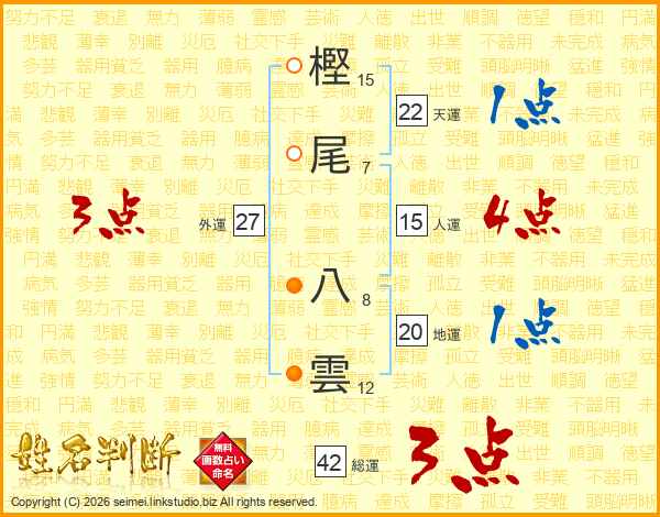 樫尾八雲さんの人運は15画の4点!