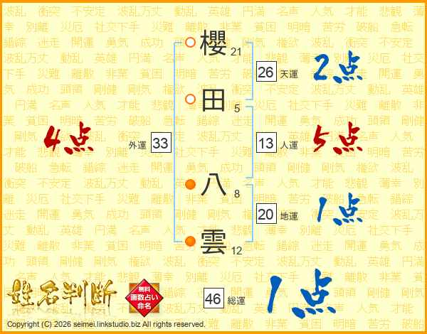 櫻(21画)田(5画) 八(8画)雲(12画)