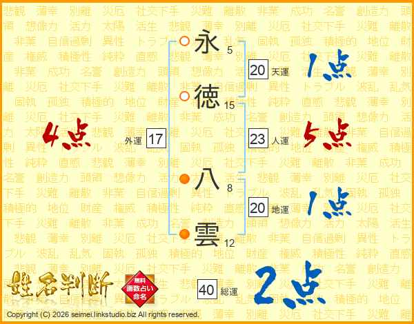 生活面を象徴する運勢です。外部から受ける影響力を表し、結婚運、家庭運や職場、環境への順応性を表します。総運から人運を引いた画数。姓や名が1文字の場合を除く。