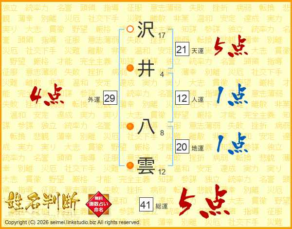 沢井八雲さんの総運は41画の5点!