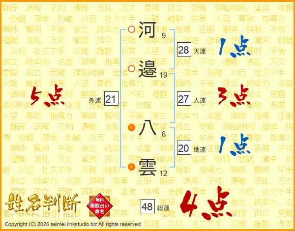 生活面を象徴する運勢です。外部から受ける影響力を表し、結婚運、家庭運や職場、環境への順応性を表します。総運から人運を引いた画数。姓や名が1文字の場合を除く。