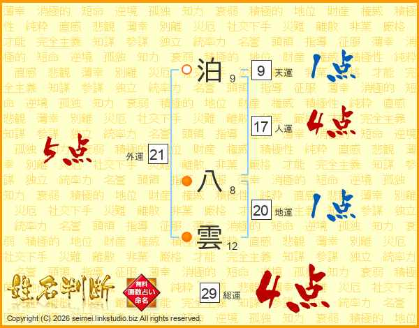 泊八雲さんの総運は29画の4点!