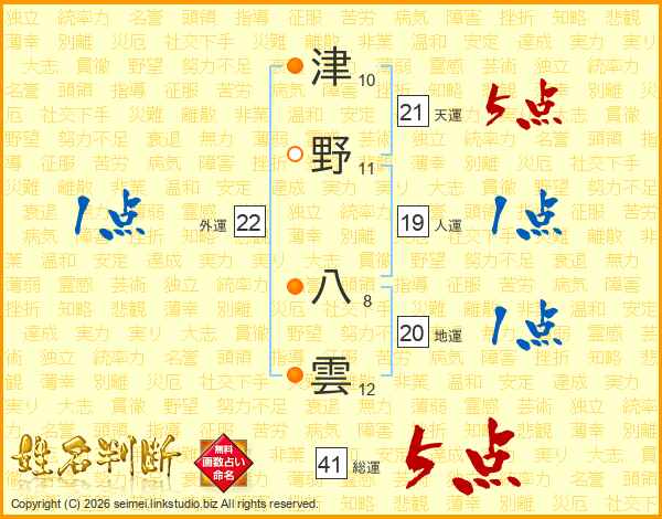 生活面を象徴する運勢です。外部から受ける影響力を表し、結婚運、家庭運や職場、環境への順応性を表します。総運から人運を引いた画数。姓や名が1文字の場合を除く。
