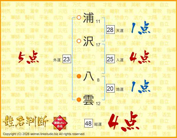 浦(11画)沢(17画) 八(8画)雲(12画)