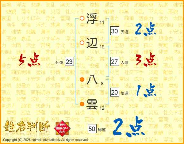 浮(11画)辺(19画) 八(8画)雲(12画)