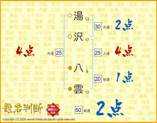 湯沢八雲さんの総運は50画の2点!