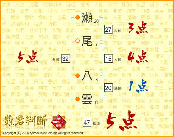 瀬(20画)尾(7画) 八(8画)雲(12画)