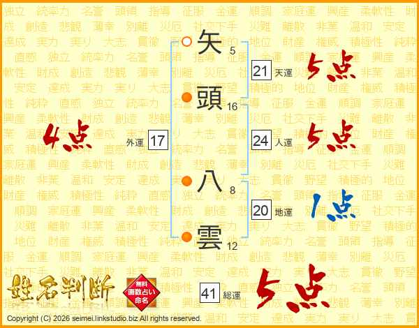 矢(5画)頭(16画) 八(8画)雲(12画)