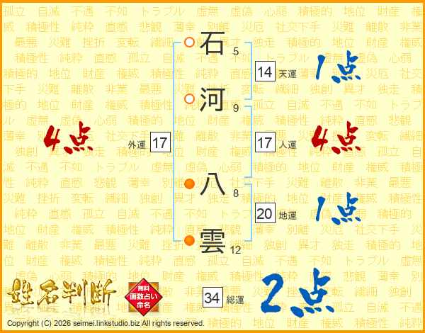 生活面を象徴する運勢です。外部から受ける影響力を表し、結婚運、家庭運や職場、環境への順応性を表します。総運から人運を引いた画数。姓や名が1文字の場合を除く。