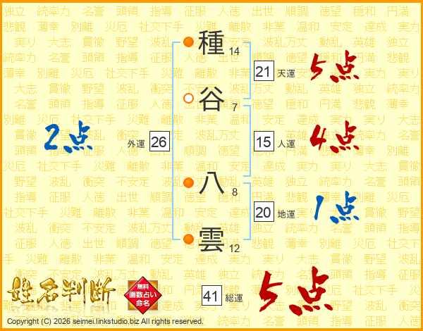 生活面を象徴する運勢です。外部から受ける影響力を表し、結婚運、家庭運や職場、環境への順応性を表します。総運から人運を引いた画数。姓や名が1文字の場合を除く。