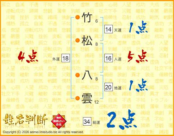 竹松八雲さんの総運は34画の2点!