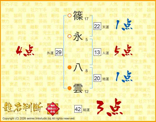 篠永八雲さんの人運は13画の5点!