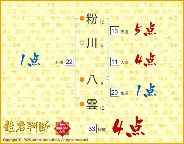 生活面を象徴する運勢です。外部から受ける影響力を表し、結婚運、家庭運や職場、環境への順応性を表します。総運から人運を引いた画数。姓や名が1文字の場合を除く。