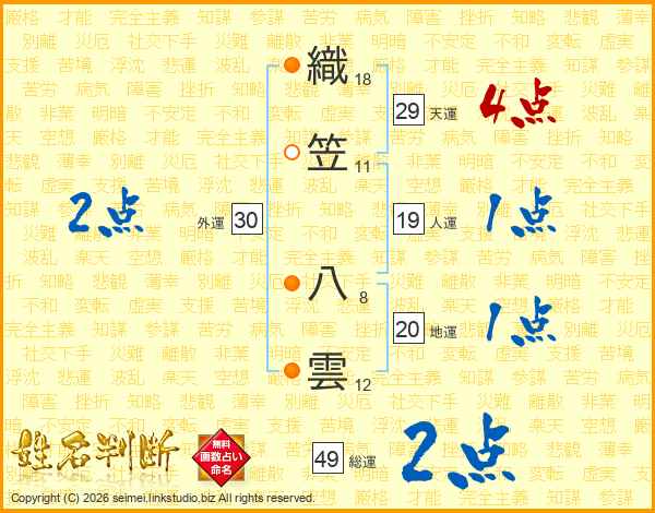 画数の奇数(○陽)と偶数(●陰)の配列で吉凶を占います。どちらかにかたよる名前は大凶名で避ける必要があります。画数の奇数偶数。